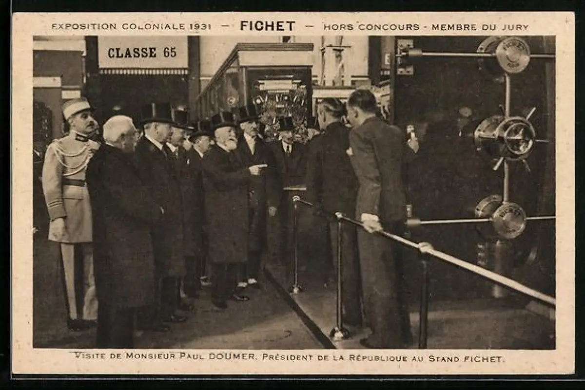 AK Visite de Monsieur Paul Doumier, Président de la Republique au Stand Fichet, Exposition Coloniale 1931, Reklame
