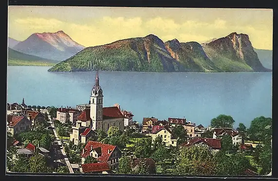 AK Vitznau, Ortsansicht mit Kirche aus der Vogelschau