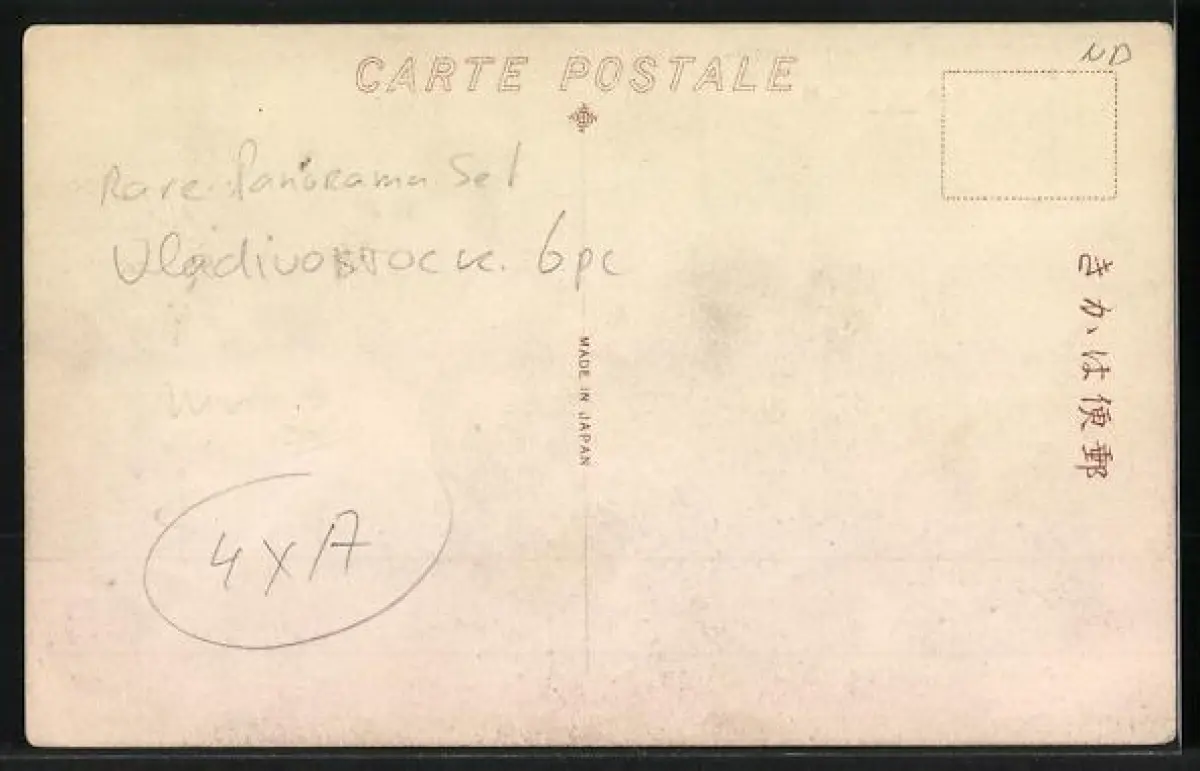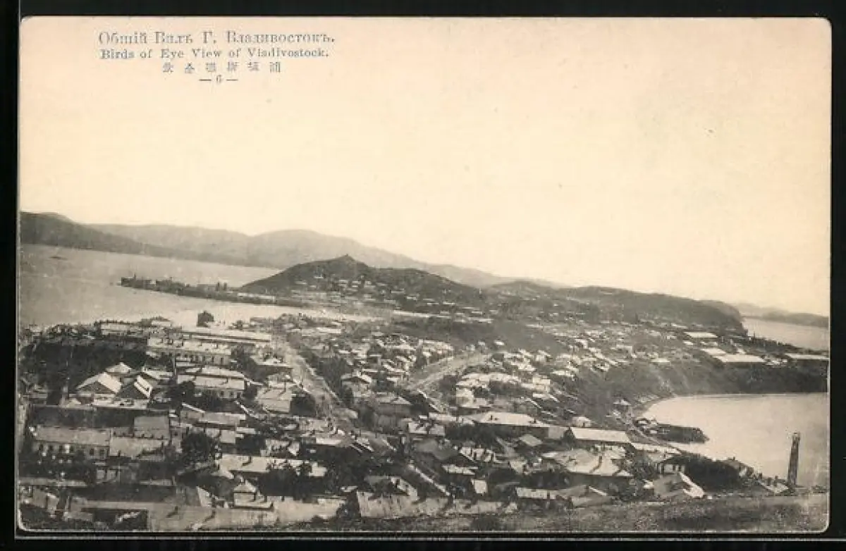 AK Vladivostock, Birds eye view of the city with harbour in the distance