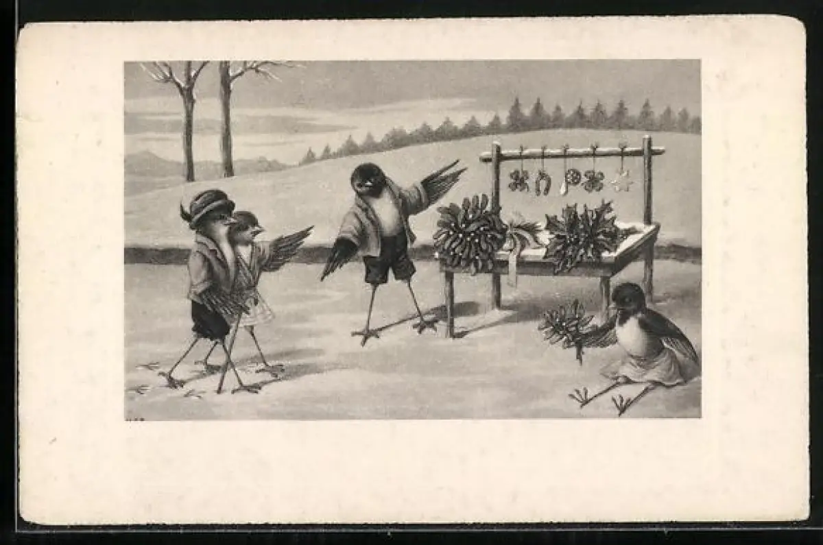 AK Vögel an einem Stand mit Glücksbringern im Schnee