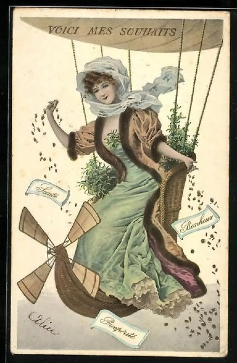 AK Voici Mes Souhaits, junge Dame sitzt in der Gondel eines Zeppelins und streut Geldstücke aus