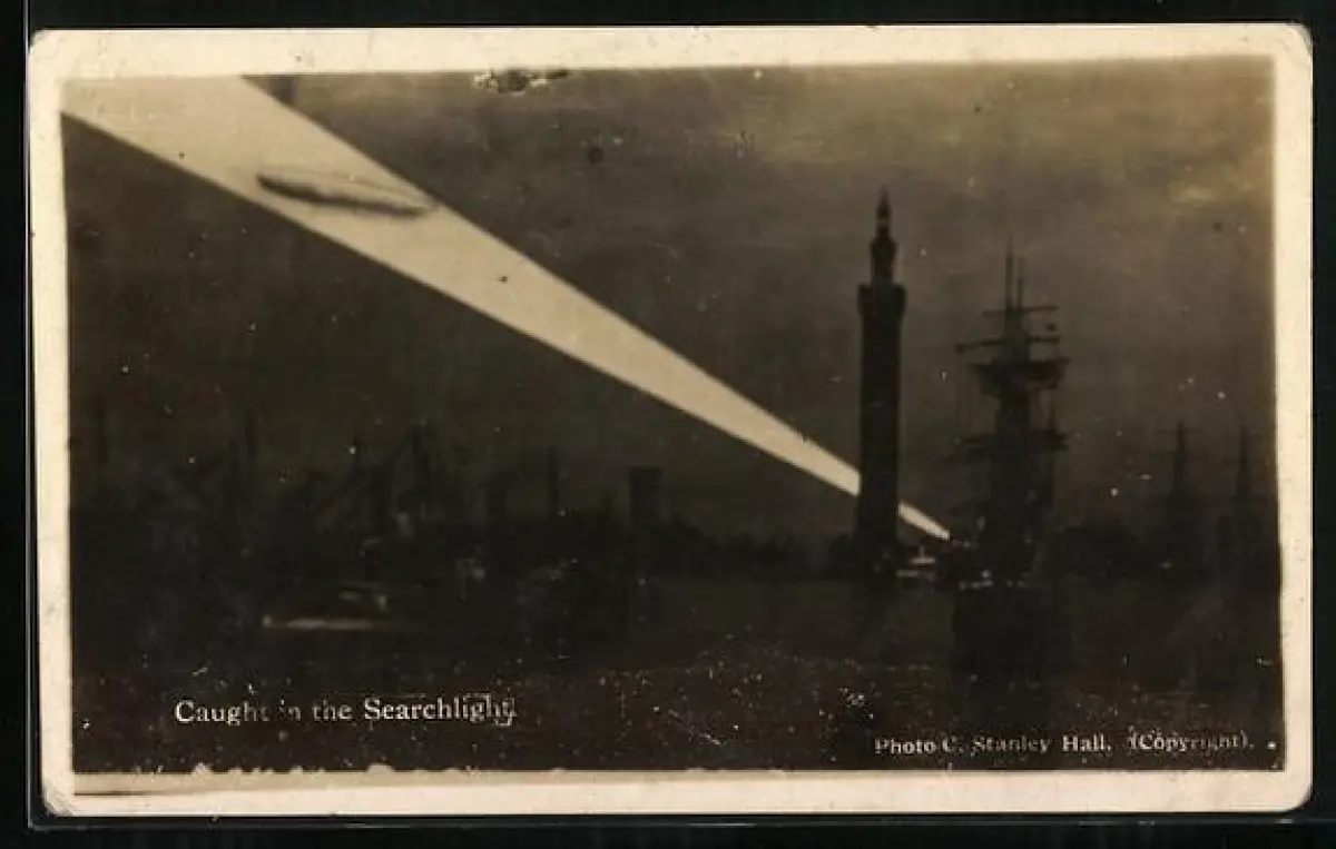 AK Von Suchscheinwerfer über Hafen erfasster deutscher Zeppelin