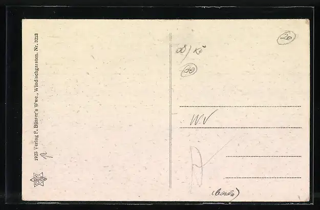 Personenbezogene Daten auf der Rückseite der Karte wurden durch blauen Textmarker unkenntlich gemacht. Die blauen Stellen sind auf die Vorderseite durchgeweicht und wirken sich negativ auf das Postkartenfoto aus