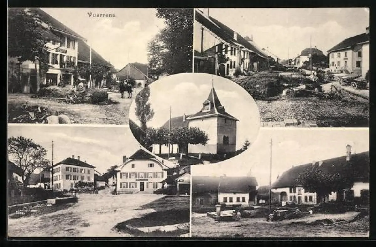 AK Vuarrens, Epicerie A. Brot, Ortspartie mit Hotel, Strassenpartie, Kirche
