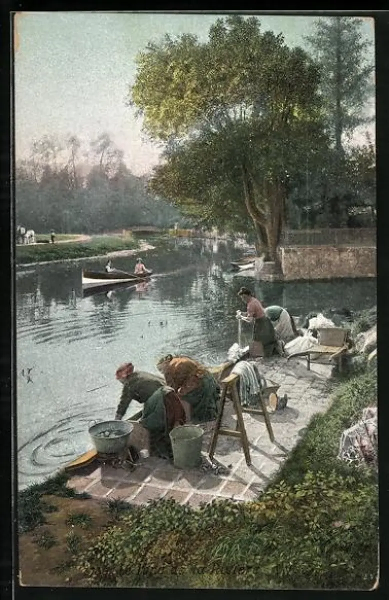AK Wäscherinnen an einem Gewässer in der Sonne