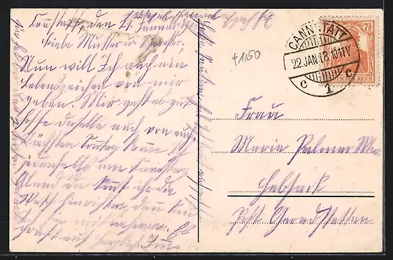 gelaufen 1918, Stempelspur, Abriebspuren li. oben u. re. unten, guter Zustand