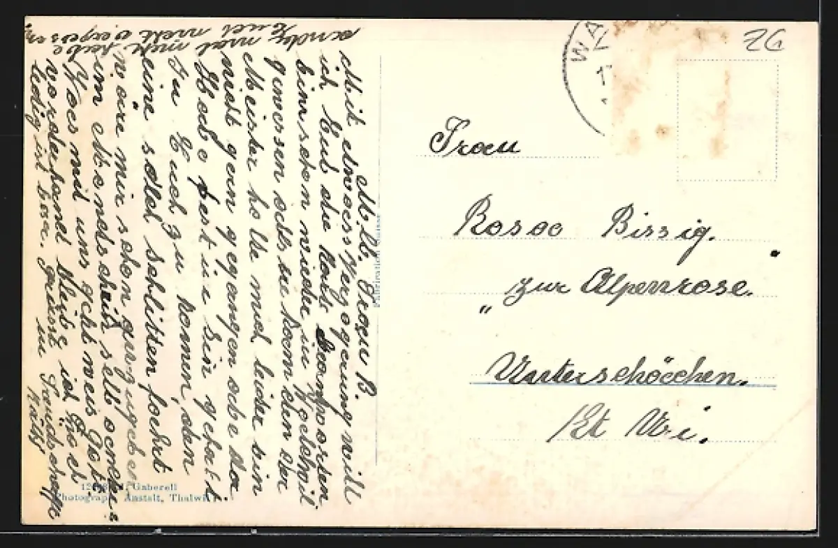 Personenbezogene Daten auf der Rückseite der Karte wurden durch blauen Textmarker unkenntlich gemacht. Die blauen Stellen sind auf die Vorderseite durchgeweicht und wirken sich negativ auf das Postkartenfoto aus