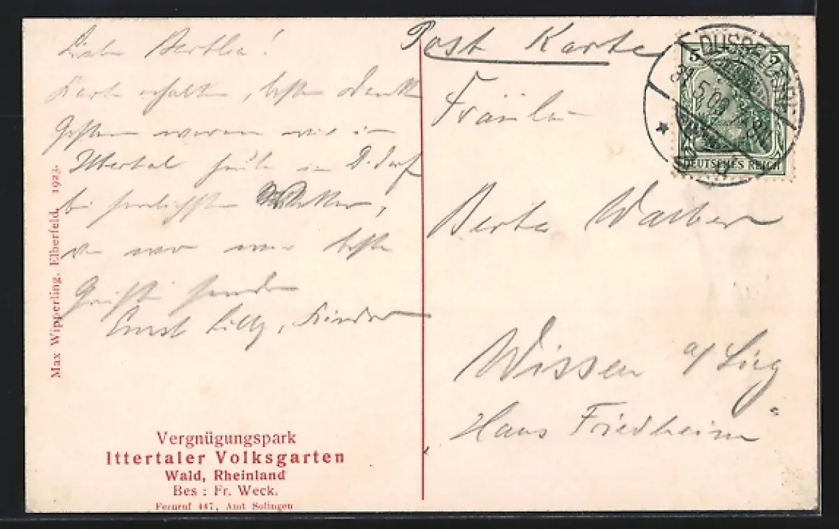 Personenbezogene Daten auf der Rückseite der Karte wurden durch blauen Textmarker unkenntlich gemacht. Die blauen Stellen sind auf die Vorderseite durchgeweicht und wirken sich negativ auf das Postkartenfoto aus