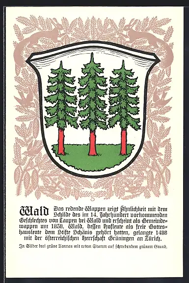 AK Wald, Wappen auf Tannen-Ornamenten, Eichhörnchen, Info-Text