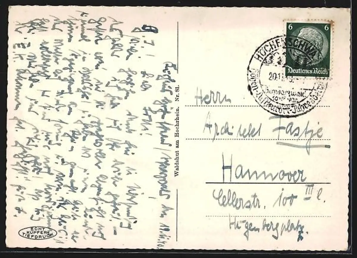 Personenbezogene Daten auf der Rückseite der Karte wurden durch blauen Textmarker unkenntlich gemacht. Die blauen Stellen sind auf die Vorderseite durchgeweicht und wirken sich negativ auf das Postkartenfoto aus