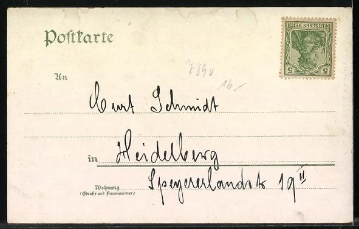 Personenbezogene Daten auf der Rückseite der Karte wurden durch blauen Textmarker unkenntlich gemacht. Die blauen Stellen sind auf die Vorderseite durchgeweicht und wirken sich negativ auf das Postkartenfoto aus