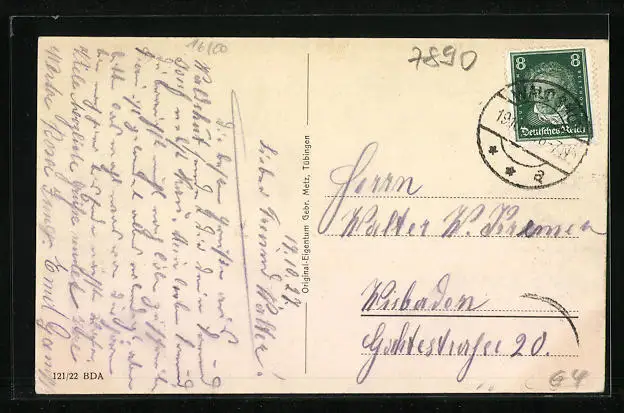 Personenbezogene Daten auf der Rückseite der Karte wurden durch blauen Textmarker unkenntlich gemacht. Die blauen Stellen sind auf die Vorderseite durchgeweicht und wirken sich negativ auf das Postkartenfoto aus