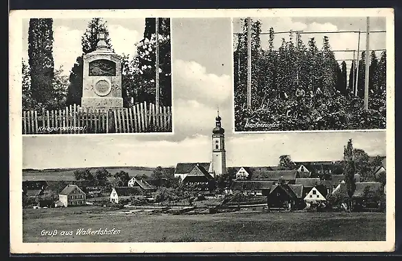 AK Walkertshofen / Hallertau, Hopfenzupfen, Kriegerdenkmal und Totalansicht
