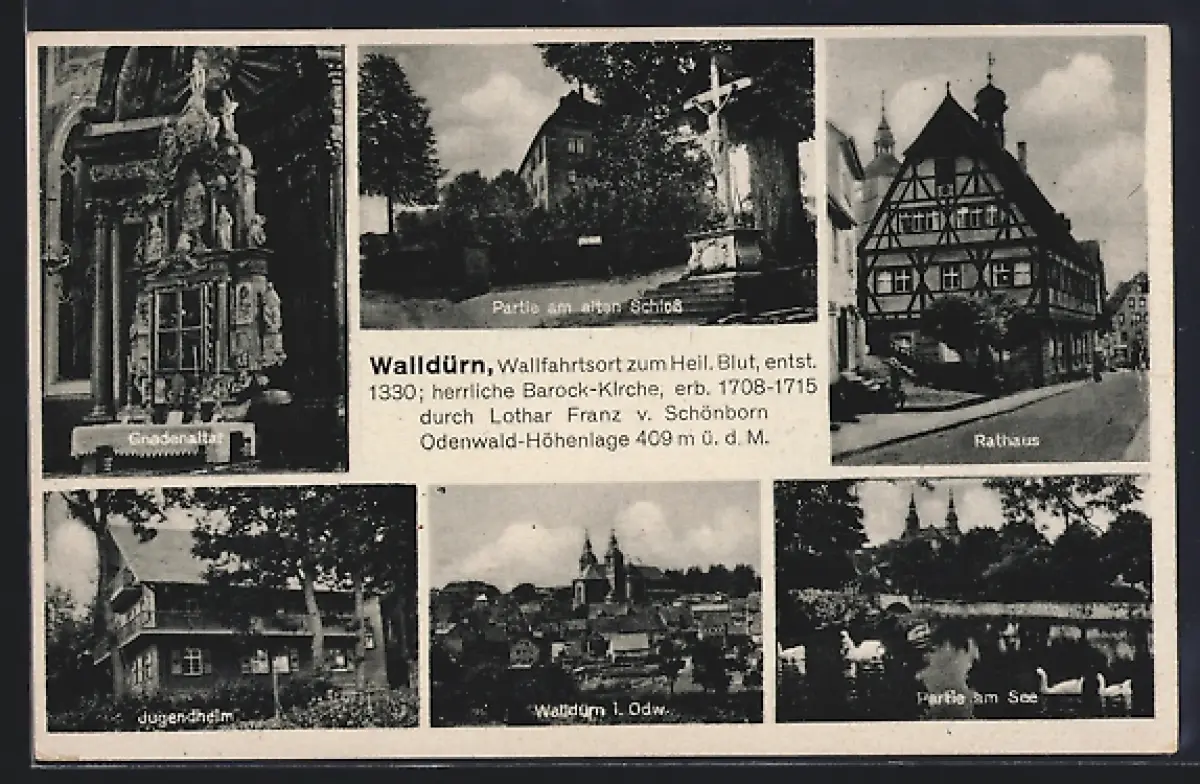 AK Walldürn, Jugendheim, Gnadenaltar, Rathaus, Ortsansicht