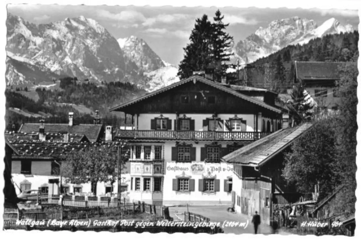 Ansichtskarte Wallgau Gasthof Post gegen Wettersteingeb. Erhaltung I ungelaufen, um 1961 Verlag: Hans Huber, Garmisch-Partenkirchen