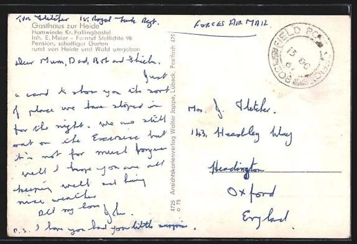 Personenbezogene Daten auf der Rückseite der Karte wurden durch blauen Textmarker unkenntlich gemacht. Die blauen Stellen sind auf die Vorderseite durchgeweicht und wirken sich negativ auf das Postkartenfoto aus