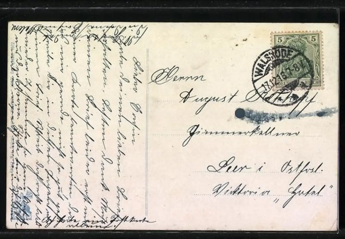 Personenbezogene Daten auf der Rückseite der Karte wurden durch blauen Textmarker unkenntlich gemacht. Die blauen Stellen sind auf die Vorderseite durchgeweicht und wirken sich negativ auf das Postkartenfoto aus