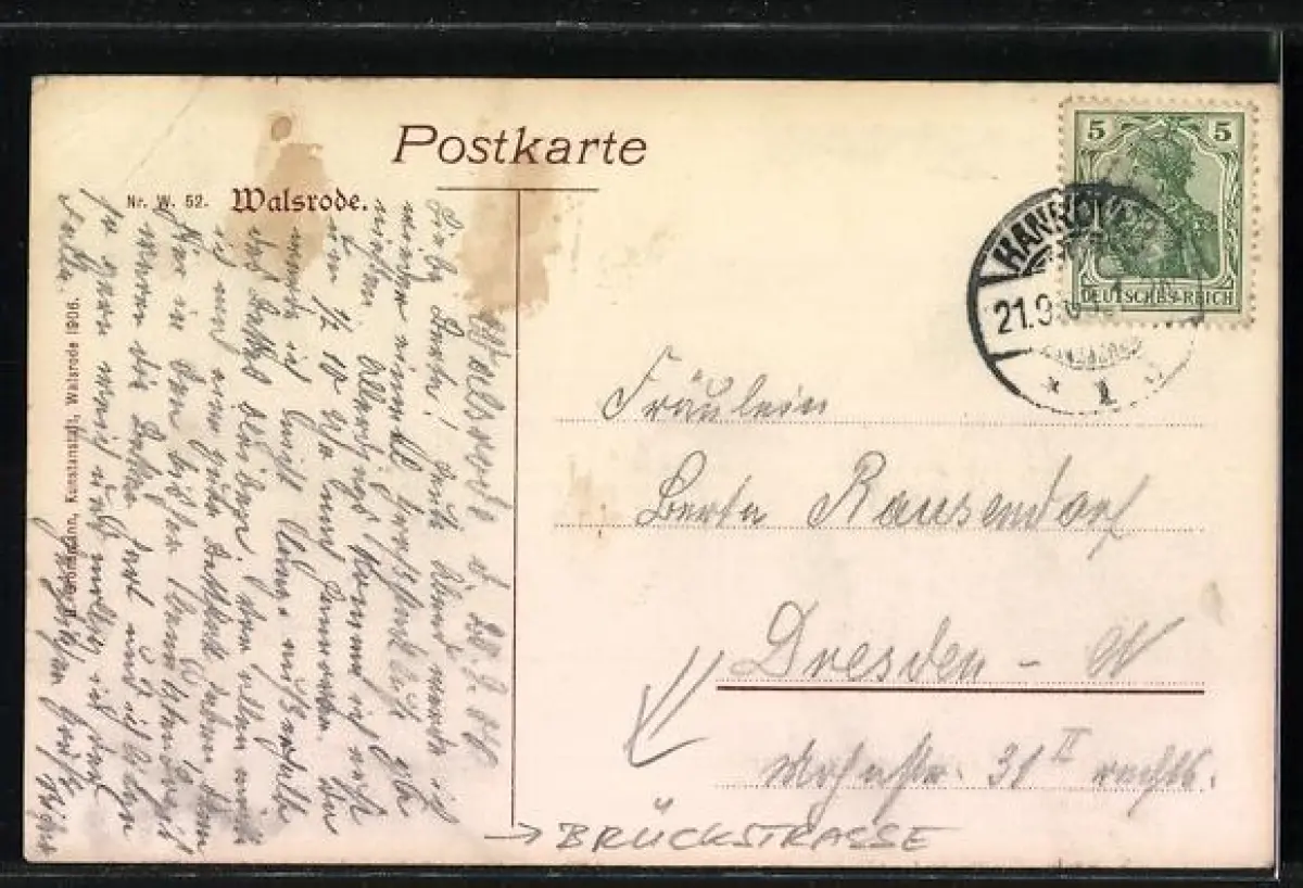 Personenbezogene Daten auf der Rückseite der Karte wurden durch blauen Textmarker unkenntlich gemacht. Die blauen Stellen sind auf die Vorderseite durchgeweicht und wirken sich negativ auf das Postkartenfoto aus