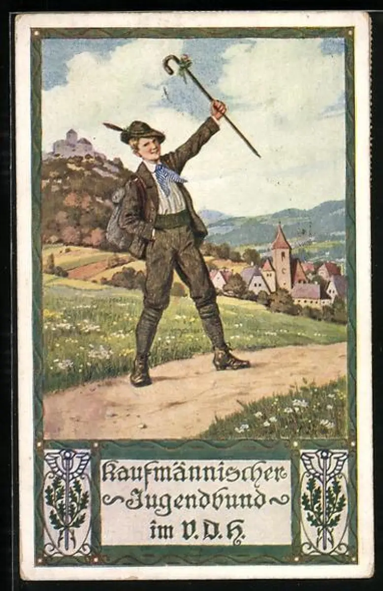 AK Wanderer berüsst freudig die vor ihm liegende Ortschaft - Kaufmännischer Jugendbund im V.D.H.