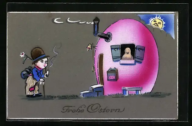 AK Wanderer trifft zu Ostern auf ein Küken im Ei
