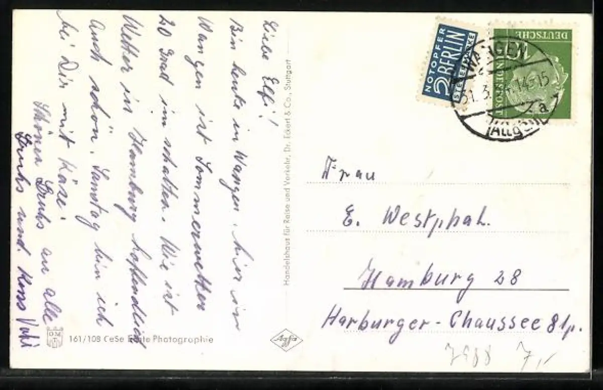 Personenbezogene Daten auf der Rückseite der Karte wurden durch blauen Textmarker unkenntlich gemacht. Die blauen Stellen sind auf die Vorderseite durchgeweicht und wirken sich negativ auf das Postkartenfoto aus