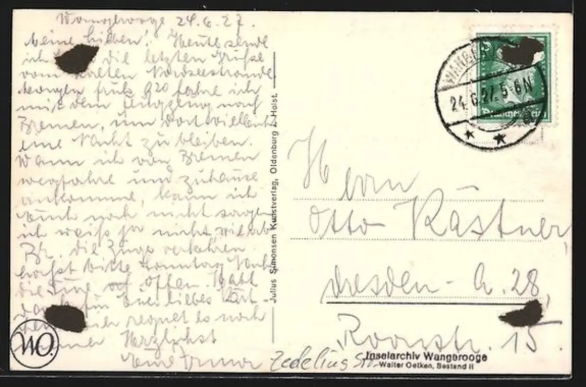 Personenbezogene Daten auf der Rückseite der Karte wurden durch blauen Textmarker unkenntlich gemacht. Die blauen Stellen sind auf die Vorderseite durchgeweicht und wirken sich negativ auf das Postkartenfoto aus