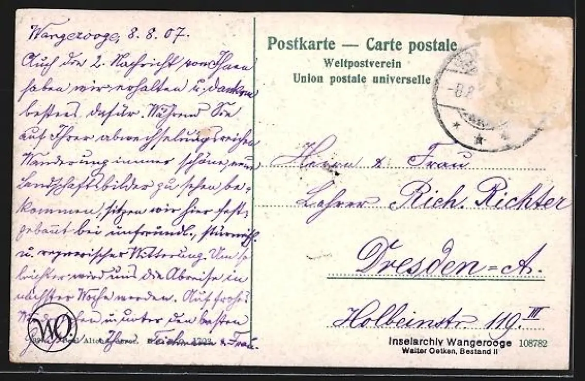 alte Ansichtskarte, gelaufen 1907, Briefmarke entfernt, rückseitig Oberflächenschaden, guter Zustand