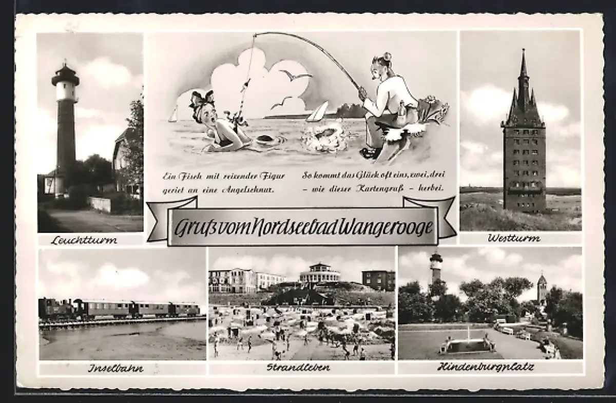 AK Wangerooge, Leuchtturm, Westturm, Strandleben, Inselbahn, Hindenburgplatz