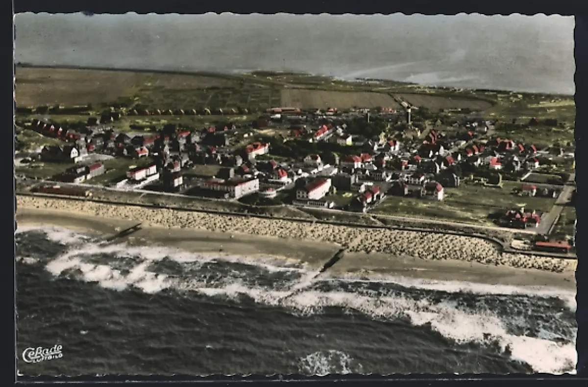 AK Wangerooge, Nordseebad, Luftaufnahme der Küste und Ortsansicht