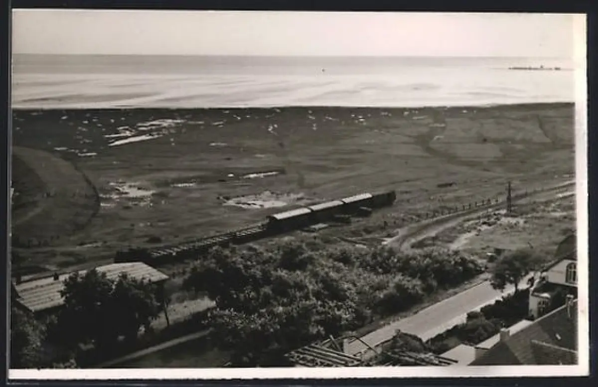 AK Wangerooge, Nordwestküste, Inselbahn Inselexpress, Blick vom Leuchtturm