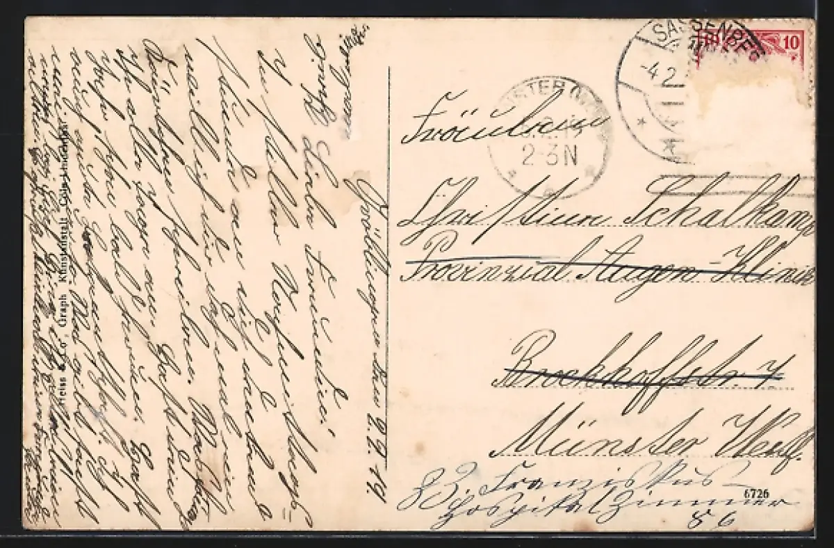 alte Ansichtskarte, gelaufen, Briefmarke entfernt, rückseitig Oberflächenschaden, Stempelspur, guter Zustand