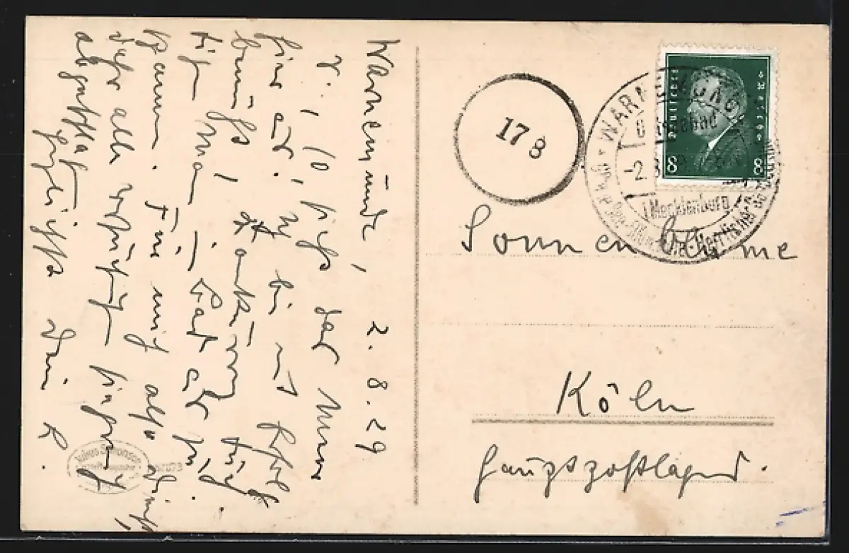 Personenbezogene Daten auf der Rückseite der Karte wurden durch blauen Textmarker unkenntlich gemacht. Die blauen Stellen sind auf die Vorderseite durchgeweicht und wirken sich negativ auf das Postkartenfoto aus