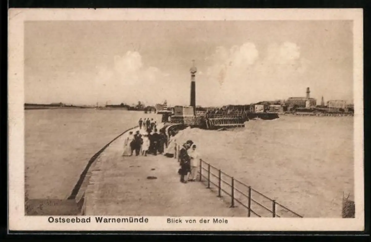 AK Warnemünde, Ostseebad, Blick von der Mole mit Leuchtturm