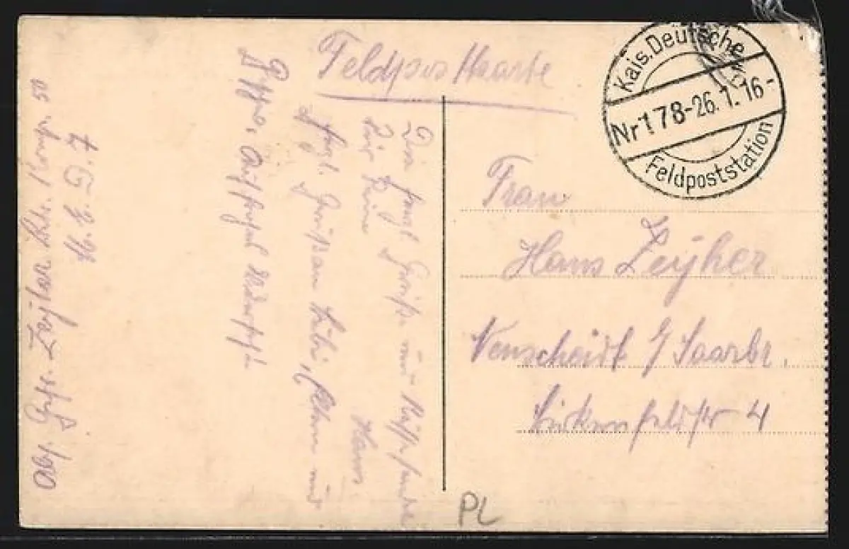 Personenbezogene Daten auf der Rückseite der Karte wurden durch blauen Textmarker unkenntlich gemacht. Die blauen Stellen sind auf die Vorderseite durchgeweicht und wirken sich negativ auf das Postkartenfoto aus