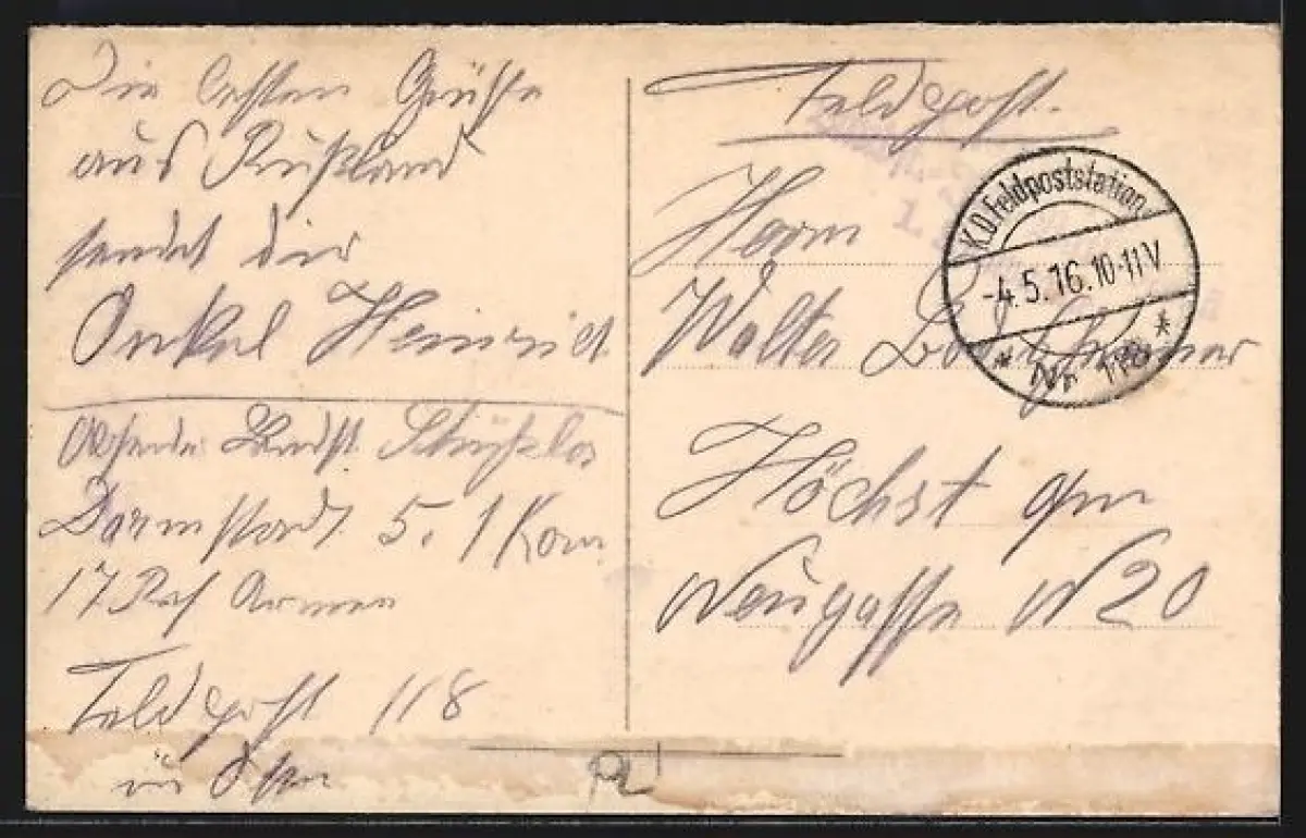 Personenbezogene Daten auf der Rückseite der Karte wurden durch blauen Textmarker unkenntlich gemacht. Die blauen Stellen sind auf die Vorderseite durchgeweicht und wirken sich negativ auf das Postkartenfoto aus