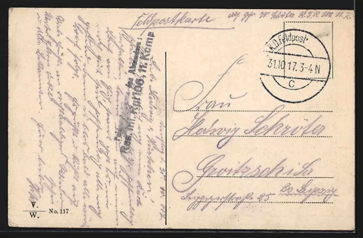 gelaufen 1917, Eckknicke li. unten und re. oben, guter Zustand