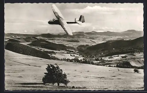 AK Wasserkuppe, Segelflieger Heinz Peters in ES 49 über dem Fuldatal