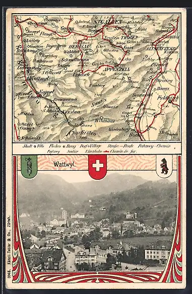 AK Wattwyl, Ortsansicht u. Landkarte mit Werdenberg, Buchs u. Feldkirch