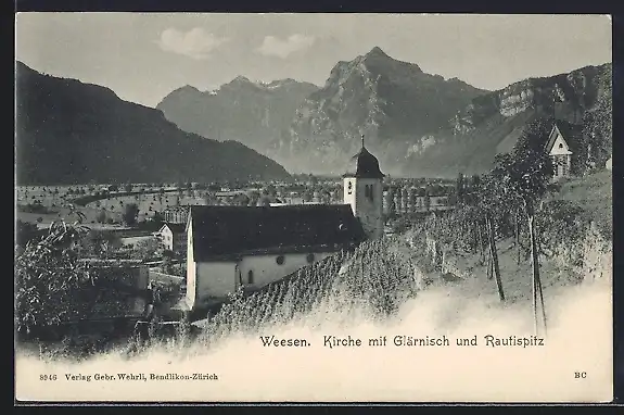 AK Weesen, Kirche mit Glärnisch und Rautispitz