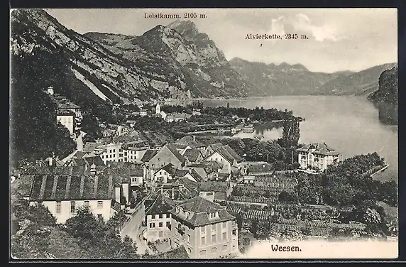 AK Weesen, Totalansicht aus der Vogelschau mit Blickm auf die Alvierkette