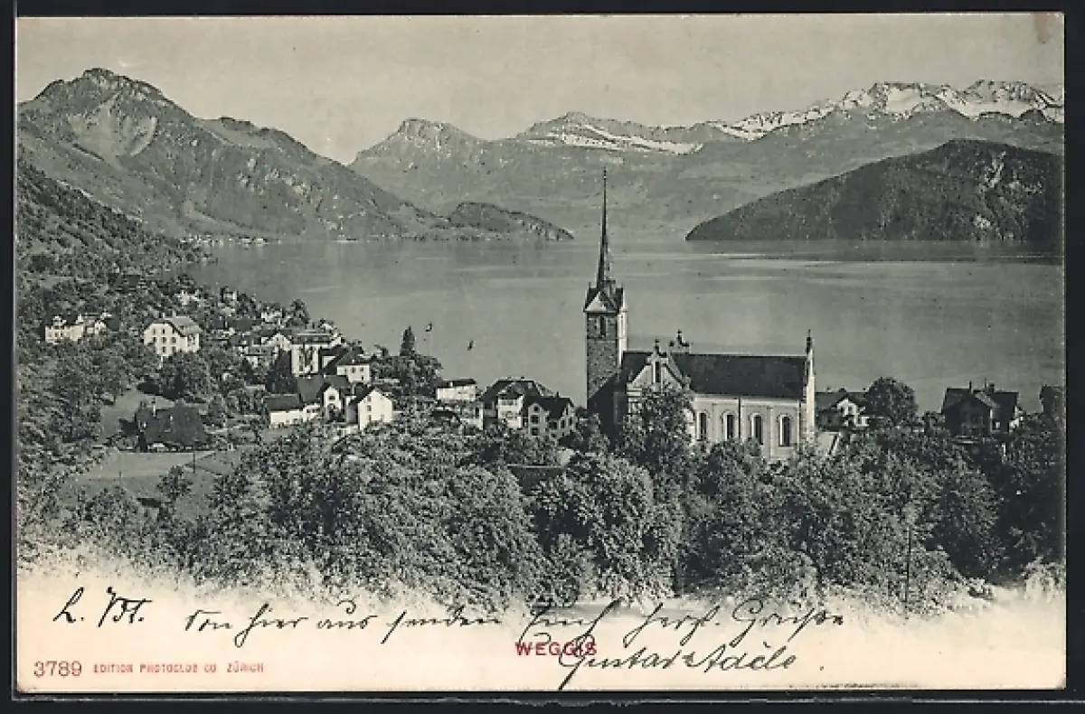 AK Weggis, Ortsansicht mit Kirche und Blick zum See