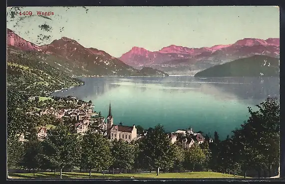 AK Weggis, Totalansicht mit See und Bergpanorama