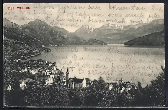 AK Weggis, Totalansicht mit Wasserblick und Bergpanorama