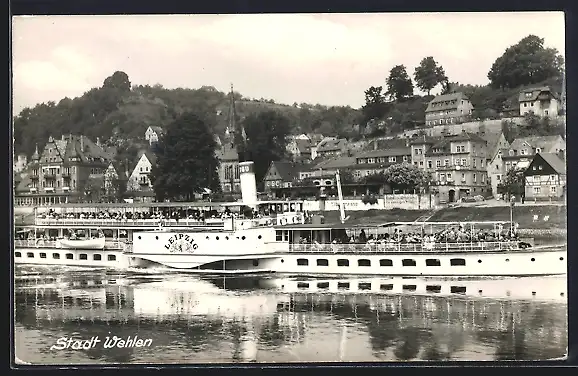 AK Wehlen, Dampfer Leipzig auf der Elbe, Blick zum Ort
