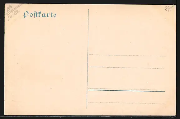 Personenbezogene Daten auf der Rückseite der Karte wurden durch blauen Textmarker unkenntlich gemacht. Die blauen Stellen sind auf die Vorderseite durchgeweicht und wirken sich negativ auf das Postkartenfoto aus