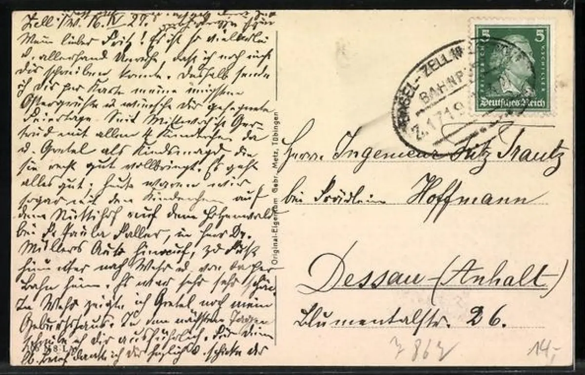 Personenbezogene Daten auf der Rückseite der Karte wurden durch blauen Textmarker unkenntlich gemacht. Die blauen Stellen sind auf die Vorderseite durchgeweicht und wirken sich negativ auf das Postkartenfoto aus