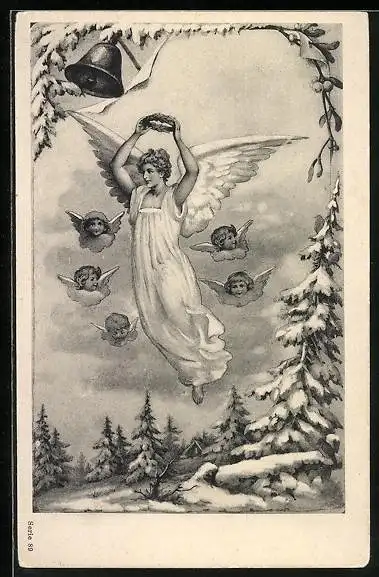 AK Weihnachtsengel schwebt über verschneitem Wald