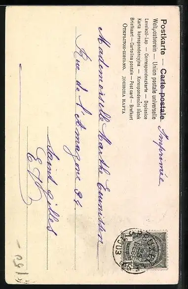 Personenbezogene Daten auf der Rückseite der Karte wurden durch blauen Textmarker unkenntlich gemacht. Die blauen Stellen sind auf die Vorderseite durchgeweicht und wirken sich negativ auf das Postkartenfoto aus