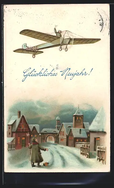 AK Weihnachtsgruss, Flieger im frühen Flugzeug winkt Nachtwächter zu