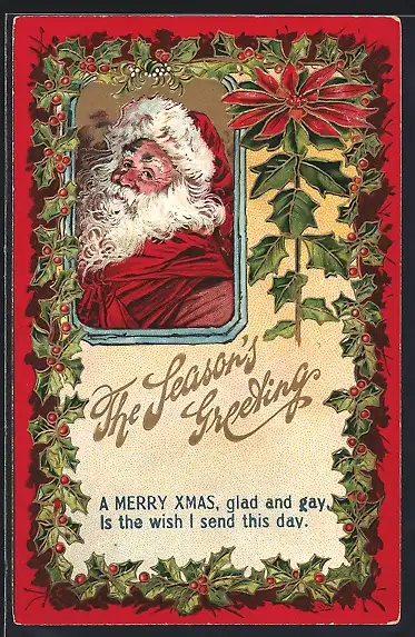 AK Weihnachtsmann gerahmt von Stechpalmenzweigen, The Seasons Greeting
